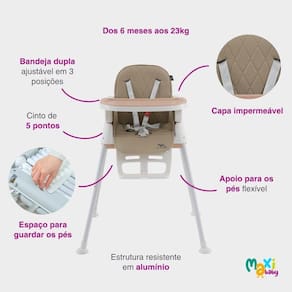Cadeira De Alimentação Infantil Compacta 3 em 1 Harmony Cinza Maxi Baby A Cadeira de Alimentação 3 em 1 Harmony Maxi Baby foi desenvolvida para proporcionar praticidade, segurança e conforto para os pequenos durante as refeições e momentos de lazer. Com um design multifuncional, transformando-se de cadeira Alta para cadeira de encaixe até cadeirinha infantil. Modo Cadeira Alta: O tradicional Cadeirão de Alimentação, neste estágio a cadeira fica mais alta facilitando o acesso para os pais na hora da introdução alimentar da criança, indicado para crianças a partir de 6 meses até 15kgs. Modo Cadeira de Encaixe: Permite adaptar a cadeira de alimentação em cadeiras de mesa comuns com a ajuda de cintos de segurança fixados sobre a base da cadeira de mesa. Permitindo que a criança participe de todos os momentos entre família nas horas das refeições. Indicado para crianças a partir de 12 meses até 23kgs. Modo Cadeira de Reforço: Ideal para crianças maiores até 23kgs, podendo ser utilizada nas horas das refeições e como cadeirinha infantil comum para leitura, descanso e atividades adaptando-se às necessidades do dia a dia. Apoio de pés removível no modo Cadeira Alta e Reforço, cinto de segurança de 5 pontos entrepernas, mantém a criança segura em todas as posições, enquanto a base fixa com travamento e pés antiderrapante garante total estabilidade. Pensando na praticidade dos pais, a Cadeira Harmony conta com uma capa de PVC impermeável e uma bandeja de jantar dupla removível ajustável em três posições, permite uma limpeza rápida e pode ser lavada na máquina de lavar louças, tornando o dia a dia muito mais prático. Os materiais utilizados são resistentes a manchas, evitando acúmulo de sujeira e prolongando a durabilidade do produto. Outro grande diferencial é a facilidade de montagem e transporte. Leve e compacta, a cadeira pode ser desmontada sem necessidade de ferramentas, sendo montada em cerca de 10 minutos. Possui compartimento interno para armazenamento das peças quando desmontada. Cabe em qualquer cantinho da casa, levar para a casa de familiares ou até mesmo em viagens. Fabricada com materiais de alta qualidade, sua estrutura em alumínio e plásticos resistentes PP e ABS garante durabilidade. Produto certificado pelo INMETRO garantindo mais segurança e tranquilidade para os pais. Principais Características: - Idade recomendada: A partir de 6 meses - Modo de uso 3 em 1: Pode ser utilizada como Cadeira Alta, Cadeira de Encaixe de Mesa, Cadeira de Reforço - Cinto de segurança de 5 pontos - Bandeja removível ajustável em 3 três posições com prato de jantar duplo - Pés Antiderrapante removível - Capa Impermeável de fácil remoção - Apoio de pés removível - Possui compartimento interno para armazenamento das peças quando desmontada - Se ajusta em diversas fases da criança - Fácil de limpar: Laváveis na máquina de lavar louça. - Material resistente a manchas - Leve e portátil: Fácil de desmontar e transportar - Montagem rápida e sem ferramentas - Peso máximo suportado: 23kgs - Design ergonômico: Proporciona conforto e segurança para a criança durante as refeições. - Estrutura resistente: Fabricada com alumínio, PP e ABS para maior durabilidade e segurança. - Produto Certificado pelo INMETRO Especificações Técnicas: - Conteúdo da Embalagem: 1 Cadeira de Alimentação 3 em 1 Harmony + Manual de Instruções. - Material/ Composição: Alumínio, PP, ABS e Tecido em Poliéster - Dimensões do Produto Montado 67,0 x 60,0 x 90,0cm aprox. - Peso: 3,700kg - : 90 Dias Contra Defeito de Fabricação pelo Fabricante - Certificação pelo INMETRO Registro nº 3380/2025 - Código do Fabricante: 21860 - EAN: 7899403218609 - Marca: Maxi Baby Fotos ilustrativas Cores e modelos podem variar conforme a fabricação.