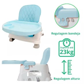 O booster de alimentação é prático. Possui regulagem de altura e da bandeja. Suporta no máximo 23kg, é adaptável em diferentes cadeiras e de fácil transporte e montagem.