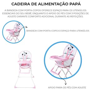 Cadeira alta de alimentação infantil papá rosa coala Cadeira alta de alimentação infantil rosa coala Código: hc15d Com um revestimento plastificado, a papá garante uma limpeza rápida e fácil, tornando o momento das refeições mais tranquilo para todos. Equipada com proteção lateral e um cinto de segurança de cinco pontos, a papá oferece um ambiente seguro e confortável para o seu bebê durante as refeições. Com uma estrutura em aço e pintura epóxi de linha premium, a papá combina durabilidade com um design elegante, garantindo que ela se adapte perfeitamente a qualquer ambiente. A bandeja com porta-copos oferece espaço para os utensílios essenciais do seu bebê, enquanto o apoio de pés com três posições de ajuste garante conforto adicional durante as refeições. Com uma trava de segurança, a papá oferece tranquilidade aos pais, garantindo que a cadeira permaneça estável durante o uso. A papá é projetada para facilitar o transporte e o armazenamento, sendo fácil de desmontar quando necessário. Principais características: Possui revestimento plastificado de fácil limpeza; Proteção lateral; Possui cinto de segurança 5 pontos Estrutura em aço, pintura epóxi linha premium Bandeja com porta-copos Apoio de pés com 3 posições de ajuste Trava de segurança Fácil desmontagem Capacidade máxima 15 kg Registro do produto no inmetro: 003348/2023 Dimensões: - medida da cadeira aberta: 100x43x74 axlxp : 12 meses direto com o fabricante