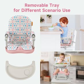 assento elevatório para cadeira alta - ?Estável e confortável? Arnês ajustável de 3 pontos mantém o bebê sentado na vertical com segurança e conforto. Alças de segurança duplas na parte inferior e nas costas As almofadas antiderrapantes garantem que a cadeira alta portátil se prenda à cadeira de forma estável e segura, evitando que o assento tombe e deslize. A almofada removível de poliuretano macio proporciona ao bebê mais confortável. - ?Dobre e leve para qualquer lugar?A cadeira alta de viagem pode ser dobrada bem plana, cabe na mala ou bolsa de viagem. Não precisa mais ter uma cadeira alta grande e volumosa sentada por aí. O assento elevatório dobrável é leve e ótimo para viajar. Escolha perfeita para levar ao restaurante, visitar os avós, acampar. - ?4 alturas ajustáveis?A altura do assento elevatório para mesa de jantar pode ser ajustada sem esforço em 4 níveis para caber em diferentes alturas de mesas e cenários de uso. Cadeiras altas para bebês e crianças pequenas adaptam diferentes estágios do crescimento do seu bebê. - ?Fácil de limpar?O assento infantil para mesa de jantar é todo de plástico e, quando fica super bagunçado, basta jogá-lo na pia e borrifar ou pode ser facilmente limpo para pequenas bagunças. A bandeja é removível, você pode colocá-la na máquina de lavar louça para uma limpeza profunda. - ?Fácil de instalar e desmontar?Prenda a uma cadeira comum com facilidade e segurança e transforme qualquer cadeira normal em cadeira alta de bebê perfeitamente. Após o uso, tire a cadeira alta dobrável, dobre e coloque em um armário até a próxima vez.