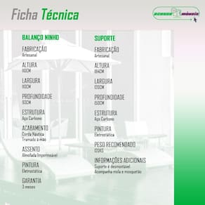 Com design moderno, acabamento impecavel e uma capacidade de ate 120 kg, ele e perfeito para momentos relaxantes e divertidos. Alem disso, acompanha uma mola para maior conforto e um mosquetao para facilitar a instalacao. Por se tratar de um produto artesanal, voce pode ter a certeza de estar adquirindo um item unico e de alta qualidade seja em um jardim, varanda ou espaco de lazer, nosso balanco suspenso vai encantar voce e seus convidados.