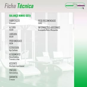 Cadeira Balanço Ninho Suspenso Gota De Fibra Com Almofada Impermeável Acesse Móveis Preto Com Branco Gelo Apresentamos a voce o Balanco Suspenso Ninho Gota: sinonimo de conforto, elegancia e durabilidade! Com sua estrutura robusta em ferro e acabamentos impecaveis em fibra sintetica de alta qualidade, o Balanco Suspenso Ninho Gota nao apenas impressiona visualmente, mas tambem oferece resistencia excepcional. Alem disso, suas molas de alta resistencia garantem uma experiencia de balanco suave e duradoura. Quanto ao acabamento, o Balanco Suspenso Ninho Gota e meticulosamente trabalhado e tramado a mao para proporcionar uma aparencia elegante e contemporanea. Seu design versatil e sofisticado se harmoniza perfeitamente com qualquer ambiente, seja no jardim, escritorio, na varanda ou no terraco. No entanto, o verdadeiro destaque do Balanco Suspenso Ninho Gota e o seu incomparavel conforto. Imagine-se envolto em uma almofada macia e aconchegante, especialmente projetada para oferecer suporte ergonomico e relaxamento supremo. Feita com um material impermeavel de alta qualidade, voce pode desfrutar de momentos de leitura, meditacao ou simplesmente relaxar. Alem disso, a seguranca e uma prioridade inegociavel para nos. O Balanco Suspenso Ninho Gota foi projetado com os mais altos padroes de qualidade e seguranca em mente. Cada detalhe foi cuidadosamente examinado para garantir sua tranquilidade ao desfrutar de momentos de diversao e relaxamento. Sinta-se confiante e seguro enquanto aproveita o Balanco Suspenso Ninho Gota. Independentemente de voce desejar criar um oasis de descanso em seu jardim, adicionar um toque especial a sua varanda ou proporcionar um local agradavel para relaxar em sua area externa ou escritorio, o Balanco Suspenso Ninho Gota e a escolha perfeita para voce. Experimente o conforto incomparavel, a elegancia duradoura e os beneficios revigorantes que o Balanco Suspenso Ninho Gota tem a oferecer. Caracteristicas: Marca: Acesse Moveis; Modelo: Balanco Suspenso Ninho Gota; Material da Estrutura: Aco Carbono; Acabamento: Fibra Sintetica; Material do Assento: Tecido Impermeavel; Enchimento do Assento: Espuma flocada; Acompanha Almofada? Somente a almofada do assento; Possui Corrente? Acompanha mola e mosquetao; Possui Suporte? Nao; Suporta Ate (kg): 150kg; Necessita de Montagem?(Sim/Nao): Necessita a instalacao no local que deseja colocar o produto;
