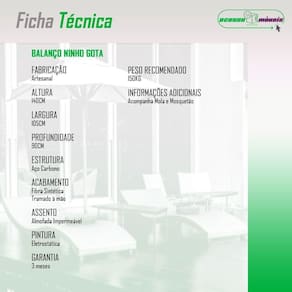 Alem disso, a seguranca e uma prioridade inegociavel para nos. O Balanco Suspenso Ninho Gota foi projetado com os mais altos padroes de qualidade e seguranca em mente. Cada detalhe foi cuidadosamente examinado para garantir sua tranquilidade ao desfrutar de momentos de diversao e relaxamento. Sinta-se confiante e seguro enquanto aproveita o Balanco Suspenso Ninho Gota.