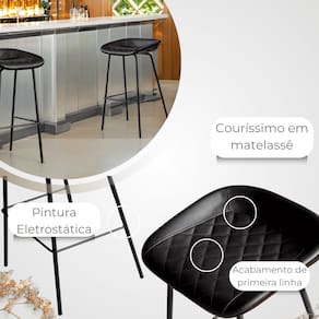 A estrutura da banqueta é fabricada em aço tubular de 20mm com pintura epóxi eletrostática preta, garantindo durabilidade e resistência. O assento, revestido em couríssimo matelassê, oferece um conforto excepcional, graças à espuma de densidade D-28 e à estrutura de madeira compensada. O acabamento em rolote revestido das bordas confere um toque de elegância ao design industrial.