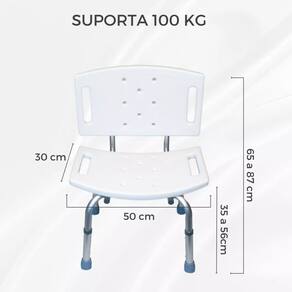 Banqueta Cadeira de Banho com Encosto Supermedy Banco para banho com corpo de alumínio anodizado, e encosto ergonômico. O assento possui encaixe de mãos com aberturas para escoar a água. Sua regulagem de altura é facilitada com pino click. É ideal para pessoas que necessitam de segurança no banho. Características - Segurança no banho e fácil higienização; - Encosto ergonômico para as costas; - Ajustável regulagem de altura através de engate rápido pino click; - Segurança: encaixe de mão no assento; - Textura no assento para maior aderência; - Ergonomia: Assento curvo para melhor postura e encaixe; - Ponteiras de borracha com ventosas para melhor fixação no chão; - Assento com aberturas para escoar água; - Alta resistência a umidade; - Suporta até 100 Kg;