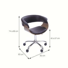 Especificações Técnicas: Cor: Preta Peso: 7,6 kg Altura: 0,74m Comprimento: 0,4m Largura: 0,6m Ideal para uso: Interno Peso suportado: 120Kg Pode ser empilhada Não EAN: 7908146214110 Modelo: Elba Base: Rodízio Material: Estrutura em madeira laminada com assento em espuma revestida em PU. Base cromada, com ajuste de altura, giratória e rodas em PU Garantia: O produto possui garantia do fornecedor de 6 meses contra defeitos de fabricação a partir da emissão da nota fiscal.