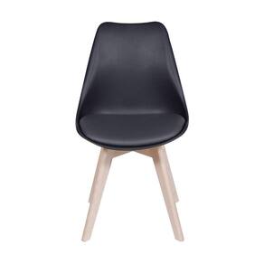 A cadeira possui uma almofada no assento revestida em PU, garantindo maior conforto ao usuário e pés em madeira.