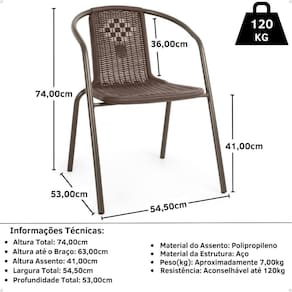 Tonalidade: Marrom | Altura: 74 | Produto: Cadeira Indaiá com Braços | Largura: 54,50 | Material da Estrutura: Aço | Cor: Marrom | Peso do Produto: 7 | Estado de Origem: SC | Material para Filtro: Polipropileno | Largura do Produto (cm): 54,50 | Peso do Produto (Kg): 7 | Comprimento do Produto (cm): 53 | Altura do Produto (cm): 74 | Profundidade Montado: 53 | Largura Montado: 54,50 | Altura Montado: 74 | Fabricante: Magazine Decor | Acompanha Almofada: Não | Pronfundidade: 53 | Cômodo Indicado: Cozinhas | Garantia do Fabricante: 3 | Profundidade: 53 | Acompanha Braço: Sim | Nome do Simples no Fornecedor: Cadeira Indaiá com Braços | Conteúdo da Embalagem: 1 Cadeira | Necessita Montagem: Não | Instruções/Cuidados: Não Limpar com Materiais Abrasivos | batteries_required: Não | is_fragile: Não | part_number: 1 | number_of_boxes: 1 | Descrição do Tamanho: 74x54,50x53 | model_number: 1 | bullet_point#0: Material resistente e durável | bullet_point#1: Leve e prática que facilita o armazenamento | bullet_point#2: Ideal para cozinhas, varandas, escritórios e áreas externas | number_of_items: 1 | Certificação de Teste Externo: Não