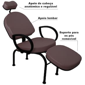 Características: - Cor do estofado: CAFÉ em Tecido Sintético Facto, o tecido Facto é resistente ao uso de Álcool 70 para limpeza e higienização - Encosto de cabeça anatômico, com altura ajustável, que apoia a nuca, dando conforto para o cliente e a firmeza que o profissional precisa - Apoio lombar, para que seu cliente se sinta confortável pelo tempo que necessite para execução do procedimento - Apoio de pernas: além de deixar seu cliente relaxado, tem a altura certa para procedimentos nos pés e unhas dos pés. Pode ser removível - Apoio de braços em P.U., material resistente e com toque macio - Cadeira de apoio para profissional, tipo mocho, para procedimentos onde o profissional pode executar sentado. Possui regulagem de altura e espuma injetada Medidas da cadeira: Medidas montada: 130cm x 63cm x 85cm Sem o apoio de pé: 90cm x 63cm x 85cm Medidas internas no assento: largura 49cm x Profundidade 48 cm Medidas internas do encosto: Largura 47,5cm x Altura 42cm Medida do assento ao chão: Parte próxima ao encosto 42cm x Parte próxima ao apoio de pés 52cm Alturas do apoio de pés: Mínima 39,5 cm e Máxima 49 cm Medidas aproximadas, podendo haver pequenas variações Suporta até 160Kg distribuídos Peso 19kg Medidas do mocho: Altura mínima 53cm e máxima 64cm Assento 38cm diâmetro Pentapé 53cm diâmetro Suporta até 120Kg distribuídos Todas as medidas são aproximadas podendo haver pequenas variações.