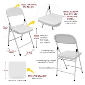 Cadeira De Aço Dobrável Branca - 10.403.01 - Açomix Cadeira de Aço Dobrável Branca - 10.403.01 - AÇOMIX Características: - Suporta 120kg - Peso: 3,185kg - Única cadeira com trava de segurança dupla no pé traseiro - Única cadeira fabricada no Brasil com assento estampado - Trava de segurança com ponteira anatômica - Pintura a pó epóxi - Tratamento antiferrugem