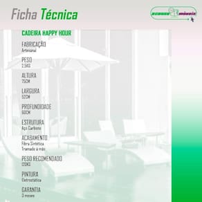 A cadeira Happy Hour e a escolha perfeita para criar um ambiente aconchegante e descontraido em qualquer espaco da sua casa. Sua estrutura e feita em aco carbono, garantindo robustez e resistencia. Alem disso, a cadeira e protegida por uma camada de pintura eletrostatica em po (epoxi), o que lhe confere um excelente acabamento, o que a torna ideal para uso ao ar livre. Possui encosto e assento revestidos em fibra sintetica de alta qualidade, dando um toque de charme e sofisticacao ao movel, trazendo conforto e durabilidade. Perfeita para ser utilizada em diversos espacos da casa, seja na edicula, na varanda, na churrasqueira, na beira da piscina ou em qualquer outra area ao ar livre, ela se adapta facilmente a diferentes estilos de decoracao.