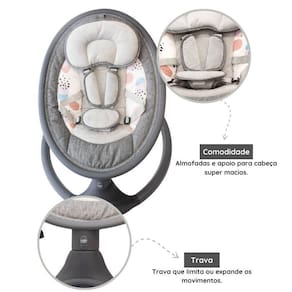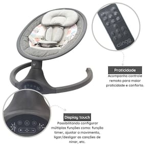 Características Técnicas: Peso máximo suportado: 9kg Conectividade Bluetooth Design em alumínio. Não apenas a torna leve e resistente, mas também portátil, sendo bem conveniente Com display touch e controle remoto multifunções Funciona com pilhas ou na tomada, sendo perfeita para qualquer lugar Botão liga/desliga Trava que limita ou expande os movimentos Botão com cinco opções de movimentos Botão que reproduz canções de ninar e ajuste de volume Botão de Pause/Play interrompa ou retome as canções de ninar quando quiser Função timer com três opções: 5min, 15min e 30min Almofadas e apoio para cabeça super macios Cinto com ponta dupla para maior segurança