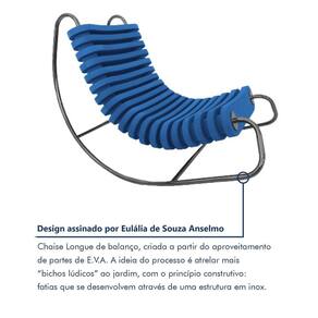 Produto conceitual assinado por Eulália de Souza Anselmo, a Anelídeo Balanço nasce a partir do aproveitamento de partes de E. V. A, material utilizado para a anelídeos Chaise Lounge, conhecida como a minhoca de jardim que flutua. A ideia do processo é atrelar mais bichos lúdicos ao jardim, com o mesmo princípio construtivo: fatias que se desenvolvem através de uma estrutura em inox. Acabamento da Estrutura: Não se Aplica Ambiente Principal: Jardim e Varanda Cor: Azul Cor do Produto: Azul Escala de Brilho: Semi-Fosco Estrutura do Assento: Aço Inox Estrutura do Encosto: Aço Inox Giratória: Não Itens Inclusos: 1 Cadeira Linha ou Coleção: Anelídeos Marca: Prima Design Necessita Montagem: Não Origem do Produto: Nacional Peso: 15 kg Possui Apoio Para os Pés: Não Possui Rodízio: Não Recomendações de Uso, Manutenção e Limpeza: A limpeza deve ser realizada com esponjas ou escovas de cerdas macias, sabão ou detergente neutros e água em abundancia; o sabão ou detergente deve ser completamente removido com água; não é aconselhada a aplicação de impermeabilizantes, pois podem provocar manchas. Estrutura em aço inox: mantenha a estrutura limpa utilizando pano seco de algodão ou flanela. Se necessária a utilização de pano umedecido, seque o móvel em seguida. Recomenda-se também a utilização de cera à base de silicone. Não utilize solvente, álcool, acetona, lustra moveis, produtos abrasivos e outros produtos que contenham soda e/ou ácidos para limpar e tirar manchas dos móveis. Resistente à Chuva: Sim Revestimento do Assento: EVA Revestimento do Encosto: EVA Suporta Até (kg): 400 kg Tipo de Assento: Fixo Tipo de Encosto: Fixo Marca: Não Informado