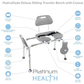 Anular Banco de duche de transferência deslizante PROFESSIONAL GRADE, banheira e cadeira de duche para duche interior. Deslizamento sem esforço para transferências fáceis e seguras dentro e fora da banheira ou chuveiro. Os produtos da Platinum Health são s em milhares de hospitais, asilos e residências particulares por usuários que valorizam qualidade, segurança, conveniência e conforto acima do preço. Esta cadeira de banho fácil de montar requer uma montagem rápida SEM FERRAMENTAS em menos de 5 minutos. 100 reversível. RECORTE DO ASSENTO COM INSERÇÃO. A abertura da cómoda nesta cadeira de banho para idosos permite o acesso desobstruído à área perineal para uma lavagem fácil e eficaz. Uma seção de inserção de encaixe está incluída que pode ser fácil e rapidamente adicionada e removida do assento conforme desejado. Um suporte de montagem mantém a seção de inserção ao alcance dos braços. Cinto de segurança incluído. POR FAVOR, REVISE AS DIMENSÕES MOSTRADAS NO DESENHO DE LINHA ANTES DE ENCOMENDAR PARA GARANTIR QUE ESTE ITEM SERÁ O USUÁRIO E A LOCALIZAÇÃO. PROJETO, CONSTRUÇÃO DE QUALIDADE INSTITUCIONAL. A estrutura do HydroGlyde é fabricada com componentes de alumínio leves e robustos. Nunca enferruja e a construção durável ajuda com qualquer oscilação, agitação ou inclinação. Capacidade de 200 kg Marca: Não Informado