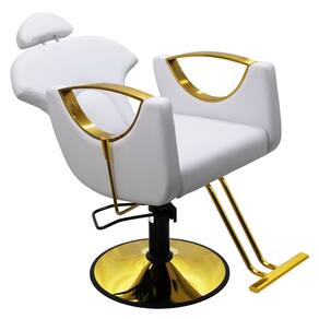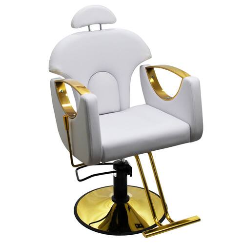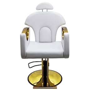 Cadeira de Cabeleireiro Belarus Reclinável Base Redonda: design autêntico e sofisticado, assento amplo e robusto, braços estofados com acabamento dourado, encosto reclinável e cabeçote com regulagem de altura e removível, tecido courino com acabamento em dupla costura e base hidráulica altamente resistente. Disponível apenas no tecido BRANCO.