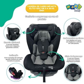 Cadeira de Carro Infantil Elite 0-36Kg Ônix Cinza Maxi Baby A cadeira Elite da Maxi Baby é uma cadeira para auto completa que irá atender todas as fases do seu filho, desde o nascimento até aproximadamente os 10 anos de idade, onde ele já estará pronto para o assento do veículo, não sendo necessário mais nenhuma cadeira de elevação. Possuí almofada removível para fácil lavagem, cinto de segurança de 5 pontos com ajuste de altura para os ombros em até 2 posições, reclinável em até 4 posições. Durante os primeiros meses do bebê, a cadeira Elite é instalada contra o movimento podendo estar nessa posição até 10kgs. Após 10kgs ela deverá ser fixada a favor do movimento e possui 4 opções de recline para melhor conforto da criança. Suas 4 posições de inclinação oferecem conforto para os passeios mais curtos ou as viagens mais longas, fazendo com que além de uma companheira da criança por toda a sua infância, seja uma grande aliada dos pais. Essa cadeirinha infantil é adequada para uso nos veículos ajustados com cintos de segurança retráteis de 3 pontos conta com o apoio de cabeça ajustável, almofada redutora de cabeça e costas, protetores de ombros e fivela com revestimento acolchoado e lavável. Produto certificado pelo INMETRO para maior segurança e conforto das crianças Principais Características: - Grupo: 0, 1, 2, 3 De 0 a 36Kg - Idade recomendada: A partir do Nascimento - No Grupo 0 Até 10kg - Deve ser instalada de costas para o movimento, fixada ao veículo com o cinto de segurança do veículo e a criança deve utilizar o cinto de segurança da própria cadeirinha - No Grupo 1 9 à 18kg - Deve ser fixada ao veículo com o cinto de segurança do veículo e a criança deve utilizar o cinto de segurança da própria cadeirinha - No Grupo 2 e 3 15 à 36kg - Deve ser utilizar sem os seus cintos de segurança da cadeira e o cinto de segurança do veículo deve prender a criança e a cadeirinha ao mesmo tempo. Utilização do cinto de segurança do veículo obrigatória a partir dos 18Kg e alternativamente à partir dos 15kgs. - Reclina em até 4 posições - Apoio de cabeça ajustável - Cinto de segurança de 5 pontos - 2 Ajustes de Ombros - Ajustador do cinto de segurança nos ombros - Dispositivo de Retenção com apoio de braço - Almofada redutora de costas e cabeça. - Protetores de Ombros e Fivela - Revestimento Acolchoado removível para lavar - Leve inclinação na base - Adequada para uso nos veículos ajustados com cintos de segurança retráteis de 3 pontos - Produto certificado pelo INMETRO Especificações Técnicas: - Conteúdo da Embalagem: 1 Cadeira de Carro + Manual de Instruções - Dimensões do Produto LxCxH : 48,0 x 53,0 x 60,0 cm aprox - Peso: 7,4 kg - Material/Composição: Plástico, Espuma, Poliuretano, Tecido - : 12 meses Contra Defeito de Fabricação Pelo Fabricante - Produto Certificado pelo INMETRO nº 009889/2022 - Referência do Fabricante: 21776 - EAN: 7899403217763 - Marca: Maxi Baby imagens meramente ilustrativas, as cores e estampas podem variar de acordo com o lote do fabricante. Marca: Não Informado