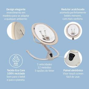 Características: Balanço Automático: Proporciona movimentos suaves que imitam o embalo do colo dos pais, acalmando o bebê e contribuindo para um sono tranquilo. Visor Touchscreen: Com controles intuitivos, oferece 2 direções de balanço, 5 velocidades e 15 melodias relaxantes para ajustar conforme a preferência do bebê. Sensor de Movimento: Detecta a agitação do bebê e ativa automaticamente o balanço, proporcionando conforto e segurança. Assento Reclinável em 2 Posições: Permite ajustar a inclinação para a posição mais confortável, garantindo o bem-estar do bebê. Almofada Redutora para Recém-Nascidos: Garante um encaixe perfeito e aconchegante para os bebês mais novos. Design Leve e Compacto: Com apenas 4kg, é fácil de transportar e se adapta a diversos ambientes, sendo ideal para uso doméstico ou em viagens. Fácil Manutenção: O revestimento com zíper pode ser removido e lavado na máquina, garantindo praticidade na limpeza.