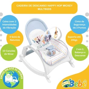 Cadeira de Descanso e Balanço Para Bebê Com Canção de Ninar Mickey - Multikids A Cadeira Happy Hop Mickey da Multikids é a opção ideal para proporcionar ao seu bebê momentos de descanso e diversão. Com um design inovador e funcional, ela é 2 em 1, podendo ser utilizada tanto no modo balanço quanto no modo cadeira de descanso, adaptando-se às necessidades do seu pequeno. Com recursos pensados para o bem-estar do bebê, ela conta com 2 brinquedos interativos que estimulam o desenvolvimento, além de um módulo musical com 10 canções de ninar e 5 sons da natureza. A função de vibração, com duas intensidades, também contribui para o relaxamento do bebê, criando um ambiente mais tranquilo e acolhedor. Seu cinto de segurança de 3 pontos, com protetor entrepernas, garante que o bebê fique sempre bem acomodado e protegido. Já o encosto acolchoado oferece 2 posições de recline, proporcionando ainda mais conforto para o pequeno. Sua estrutura leve e resistente torna o uso mais prático, enquanto os pés retráteis permitem alternar facilmente entre as funções de balanço e descanso. Outro destaque é o seu arco interativo removível e a sua estrutura dobrável, que facilita seu armazenamento e seu transporte, tornando-a perfeita para diferentes ambientes e levando ainda mais diversão para o pequeno em qualquer lugar. Aprovada pelo Inmetro, a Cadeira Happy Hop é ideal para acompanhar o crescimento do seu bebê com conforto e segurança. Principais Características: - Idade Recomendada do Nascimento até 3 Anos - Peso Máximo Suportado: 20kgs - Modelo: Happy Hop Mickey - Possui 10 Canções de Ninar e 5 Sons da Natureza - Central de Controle com 2 Ajustes de Volume - Função Vibração com 2 Intensidades - Estrutura com Fechamento Dobrável Compacto - Encosto com 2 Posições de Recline - Pés Retráteis para Uso na Função Balanço ou Descanso - Cinto de Segurança de 3 Pontos - Possui Protetor Entrepernas - Encosto Confortável Acolchoado - Estrutura Leve e Resistente - Possui 2 Brinquedinhos Interativos - Arco Interativo Removível - Necessário 4 Pilhas AA Não Inclusas - Aprovado pelo Inmetro Especificações Técnicas: - Conteúdo da Embalagem: 1 Cadeira de Descanso Happy Hop Mickey - Multikids - Dimensões do Produto Aberto AxLxP : 45,5 x 49,0 x 61,0cm - Dimensões do Produto Fechado AxLxP : 62,0 x 49,0 x 61,0cm - Composição/Material: Polipropileno, Poliéster e Ferro - Alimentação: 4 Pilhas AA Não Inclusas - Peso: 3,000kgs - : 90 dias Contra Defeitos de Fabricação Pelo Fabricante - Certificação: Inmetro 001678/2022 - Código do Fabricante: BB383 - EAN: 7908842809252 - Marca: Multikids Imagens Meramente Ilustrativas. As cores e estampas podem variar de acordo com o lote do fabricante.