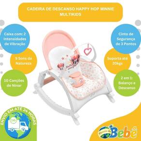Cadeira de Descanso e Balanço Para Bebê Com Canção de Ninar Minnie - Multikids A Cadeira Happy Hop Minnie da Multikids é a opção ideal para proporcionar ao seu bebê momentos de descanso e diversão. Com um design inovador e funcional, ela é 2 em 1, podendo ser utilizada tanto no modo balanço quanto no modo cadeira de descanso, adaptando-se às necessidades do seu pequeno. Com recursos pensados para o bem-estar do bebê, ela conta com 2 brinquedos interativos que estimulam o desenvolvimento, além de um módulo musical com 10 canções de ninar e 5 sons da natureza. A função de vibração, com duas intensidades, também contribui para o relaxamento do bebê, criando um ambiente mais tranquilo e acolhedor. Seu cinto de segurança de 3 pontos, com protetor entrepernas, garante que o bebê fique sempre bem acomodado e protegido. Já o encosto acolchoado oferece 2 posições de recline, proporcionando ainda mais conforto para o pequeno. Sua estrutura leve e resistente torna o uso mais prático, enquanto os pés retráteis permitem alternar facilmente entre as funções de balanço e descanso. Outro destaque é o seu arco interativo removível e a sua estrutura dobrável, que facilita seu armazenamento e seu transporte, tornando-a perfeita para diferentes ambientes e levando ainda mais diversão para o pequeno em qualquer lugar. Aprovada pelo Inmetro, a Cadeira Happy Hop é ideal para acompanhar o crescimento do seu bebê com conforto e segurança. Principais Características: - Idade Recomendada do Nascimento até 3 Anos - Peso Máximo Suportado: 20kgs - Modelo: Happy Hop Minnie - Possui 10 Canções de Ninar e 5 Sons da Natureza - Central de Controle com 2 Ajustes de Volume - Função Vibração com 2 Intensidades - Estrutura com Fechamento Dobrável Compacto - Encosto com 2 Posições de Recline - Pés Retráteis para Uso na Função Balanço ou Descanso - Cinto de Segurança de 3 Pontos - Possui Protetor Entrepernas - Encosto Confortável Acolchoado - Estrutura Leve e Resistente - Possui 2 Brinquedinhos Interativos - Arco Interativo Removível - Necessário 4 Pilhas AA Não Inclusas - Aprovado pelo Inmetro Especificações Técnicas: - Conteúdo da Embalagem: 1 Cadeira de Descanso Happy Hop Minnie - Multikids - Dimensões do Produto Aberto AxLxP : 45,5 x 49,0 x 61,0cm - Dimensões do Produto Fechado AxLxP : 62,0 x 49,0 x 61,0cm - Composição/Material: Polipropileno, Poliéster e Ferro - Alimentação: 4 Pilhas AA Não Inclusas - Peso: 3,000kgs - : 90 dias Contra Defeitos de Fabricação Pelo Fabricante - Certificação: Inmetro 001678/2022 - Código do Fabricante: BB482 - EAN: 7908842809276 - Marca: Multikids Imagens Meramente Ilustrativas. As cores e estampas podem variar de acordo com o lote do fabricante.