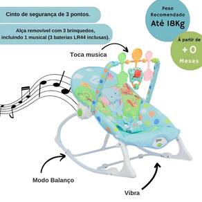 Possui um encosto ajustável e um cinto de segurança de três pontos, garantindo a segurança durante o uso. Os móbiles interativos e a barra de brinquedos removível estimulam a curiosidade e o desenvolvimento motor da criança. Com função musical e vibratória, a cadeira proporciona momentos de relaxamento e diversão.