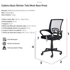 Cadeira De Escritório Basic Diretor Estofado Tela Mesh Base Giratória Preta Altura Ajustável Modelo: Cadeira Escritório Basic Diretor Tela Mesh Preta Assento: Madeira Revestida de Espuma e Acabamento em Tela Mesh Base: Polipropileno Profundidade: 55 cm Largura: 52 cm Altura Total: Alta 100 cm - Baixa 90 cm Altura do Chão Até o Assento: Alta 53 cm - Baixa 43 cm Altura do Chão Até o Braço: Alta 72 cm - Baixa 62 cm Medida Interna do Assento Profundidade 52 cm Largura 49 cm Peso Máx. Recomendado: 120 kgs Peso unitário: 10 kgs