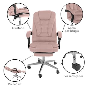 Conforto e ajustes Trabalhar em home office nunca mais será o mesmo com a nossa cadeira. Agora você pode passar horas sentado com muito conforto, sem sentir dores na coluna. O encosto reclinável permite ajustar diferentes pontos de inclinação, proporcionando maior conforto. Os apoios para os braços são ajustáveis, favorecendo a postura correta. Além disso, a cadeira possui ajuste de altura, permitindo que você a deixe na posição ideal para você. Com suas rodas giratórias, os movimentos se tornam mais fáceis, permitindo que você se movimente livremente. Para aumentar ainda mais o conforto, este modelo possui uma extensão para apoio dos pés, oferecendo mais opções de posições.