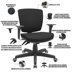 Possui alavancas de regulagem de altura do assento e inclinação do encosto.