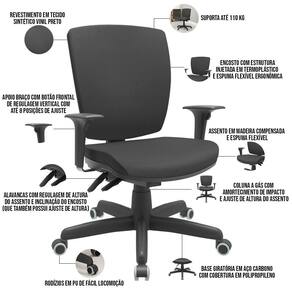 Assento em madeira compensada e estofado em espuma flexível, com coluna a gás e amortecimento de impacto.