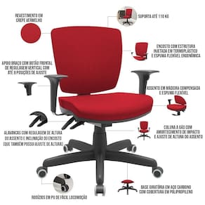 A Cadeira Executiva Giratória Flexi , é uma opção robusta e elegante para um ambiente de trabalho confortável. Essa cadeira combina elementos de design moderno e materiais duráveis para oferecer suporte ergonômico e resistência ao uso diário. Projetada para uso em ambientes de trabalho, essas cadeiras são conhecidas por sua estabilidade e durabilidade. O encosto baixo e assento estofado são características importantes dessa cadeira, pois fornecem apoio e conforto adicional para a lombar e ajudam a manter uma postura correta durante o período de ofício, é uma escolha funcional e esteticamente agradável para um ambiente de trabalho. Com seu design ergonômico, materiais resistentes e conforto adicional, essa cadeira oferece suporte adequado e durabilidade para enfrentar as demandas evitando assim o desconforto e fadiga ao longo do dia a dia no escritório. Além disso, apresenta recursos como altura ajustável, braços com regulagem vertical e rodízios para facilitar a movimentação ao redor do escritório. Adquira mais conforto para suas horas de trabalho! Dimensões do produto (L x A x P) 64 cm x 83 cm x 54 cm Medidas internas: Profundidade assento: 45 cm Largura assento: 49 cm Altura encosto: 41,1 cm Altura do chão ao assento: 45,8 á 56,6 cm Largura do encosto: 44 cm Características: Cadeira executiva, encosto com estrutura injetada em termoplástico. Apoio para braço com botão frontal de regulagem vertical, com até 8 posições de ajuste. Assento em madeira compensada e estofado em espuma ível, com coluna a gás e amortecimento de impacto. Possui alavancas de regulagem de altura do assento e inclinação do encosto. Revestimento em Poliéster na cor Vermelho. Base giratória em Aço de Carbono com cobertura em polipropileno. Rodízios em PU de fácil locomoção. Possui certificado NR-17. Suporta até 120 kg. - Por se tratar de estofado as medidas podem ter uma pequena variação de até 3 cm. - A tonalidade do produto real poderá ter ligeira variação devido o lote de tecidos. Observações importantes: - A montagem será de responsabilidade do comprador; - Responsabilizamo-nos pela em todo território , até onde as rodovias alcançam, fluviais ou aéreas devem ser cotadas a parte; - Não nos responsabilizamos, no ato da , por subir escadas/elevadores ou por guincho em apartamentos. - Eventuais despesas são de responsabilidade do comprador; - Confira as dimensões do produto e certifique-se de que passará normalmente por supostos elevadores, portas, escadas e/ou corredores de sua residência; ProductWarranty: 90 dias após o do produto | ProductInstructions: Produto para uso em ambiente interno, nao devendo ficar exposto ao sol, calor e umidade excessivos. | OriginCountry: | ProductContents: 01 Cadeira de Escritório | Color: Vermelho | ColorSimple: Vermelho | ColorFamily: Vermelho | ColorSupplier: Vermelho | SupplierSimpleName: Cadeira de Escritório Executiva Office Giratória Preto Baixa Flexi P03 Poliéster Vermelho - Lyam | MaterialFamily: Madeira | OriginState: PR | ProductLength: 67 cm | ProductWeight: 10 kg | Model: Flexi | SizeDescription: Altura: 84 cm Largura: 65 cm Profundidade: 67 cm | ProductWidth: 65 cm | Material: Madeira, espuma | ProductHeight: 84 cm