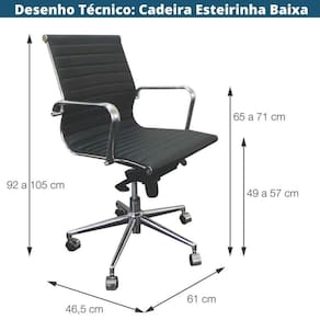 Cadeira De Escritório Giratória Baixa Esteirinha Aço Preto Poliuretano (pu) Cinza Base Rodízio Preto A Cadeira Baixa Office Esteirinha é a combinação perfeita de resistência, durabilidade e conforto, ideal para qualquer ambiente de trabalho. Inspirada nos renomados designs de Charles e Ray Eames, esta peça traz um toque de sofisticação e funcionalidade, adaptando-se facilmente a espaços versáteis e modernos. Com uma base em aço pintado, a cadeira oferece uma estrutura robusta e confiável, enquanto o assento em poliuretano (PU) proporciona conforto superior e uma experiência ergonômica para longos períodos de uso. É a escolha ideal para quem valoriza tanto o design quanto a praticidade no dia a dia. Sempre sem abrir mão do conforto e sofisticação, a Or Design é importadora de móveis perfeita para quem procura qualidade, design e charme. Desde móveis para decoração em geral até móveis para escritório a Or Design oferece o que há de melhor no mercado. Encontre aqui o móvel perfeito para o seu ambiente. Cor: Cinza | Materiais: Poliuretano | Estilo de Decoração: Moderno | Linha: Esteirinha | Marca: Ór Design | Peso Suportado: 120.00 | Tipo de Base: Rodízio | Atributos: Confortável, Prática, Versátil | Área de Uso: Interna | (tempo): 6 meses | (descritivo): contra defeitos de fabricação de 06 meses. Consulte as nossas políticas. | Peso: 14.40 | Medidas: Largura (cm): 61.00 | Medidas: Profundidade (cm): 46.50 | Medidas: Altura (cm): 105.00 | Medidas: Altura até o Assento (cm): de 49.00 a 57.00 | Medidas: Altura até o Braço (cm): De 65.00 a 71.00 | Medidas: Regulagem de altura (cm): De 92.00 a 105.00 | Possui Braços?: Sim | Possui Braços Reguláveis?: Não | Possui Regulagem de Altura?: Sim | Entregue Montado?: Não | Possui Manual de Montagem?: Acompanha o Produto | Origem do Produto: Importado | Conservação e Manutenção: Limpeza com pano úmido em solução de água e detergente neutro. Secar em seguida. | Acabamento: Fosco | Possui Estrutura Giratória?: Sim | Tipo de Assento: Fixo | Tipo de Encosto: Diretor | Estado de Origem: SP | Conteúdo da Embalagem: 01 Cadeira | Produto: Cadeira Escritório Giratória Baixa Esteirinha Or Design em Poliuretano (PU) Cinza Base Rodízio Preto | Tonalidade: Cinza | Ambiente indicado: Escritório | Material da estrutura: Metal | Montagem: Desmontado | Capacidade de Peso: 120