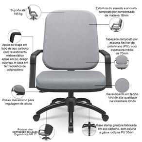 Color: Cinza | Com rodas: Sim | Modelo: Magno | OriginCountry: Brasil | ProductWeight: 25 kg | Model: Magno | Formato de venda: Unitário | Requer montagem: Sim | OriginState: PR | ColorSimple: Cinza | ProductWarranty: 90 dias após o recebimento do produto | SizeDescription: Altura: 115 cm x Largura: 71 cm x Profundidade: 73 cm | Número de registrocertificação INMETRO: ABNT NBR 13962, NR 17 | Cor: Cinza | Materiais do aro para pés: na | Modelo detalhado: Magno Giratória Base Preta | Com apoio de braços: Sim | Material do estofamento: Vinil | SupplierSimpleName: Cadeira de Escritório Giratória com Braço Preta Magno P03 Vinil Cinza - Lyam Decor | Tipo de cadeira de escritório: Cadeira Giratória Operativa Plus Size | ColorFamily: Cinza | ProductWidth: 71 cm | ProductContents: 01 Cadeira Giratória, manual de instruções | ProductHeight: 115 cm | Material: Base Giratória de Aço Carbono, Espuma Flexível Poliuretano, Vinil | ProductInstructions: Produto para uso em ambiente interno, nao devendo ficar exposto ao sol, calor e umidade excessivos. | MaterialFamily: Vinil | ColorSupplier: Cinza | Com aro para pés: Não | ProductLength: 73 cm