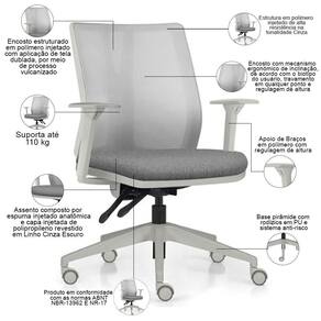 Color: CinzaCinza Escuro | ColorFamily: Cinza | ColorSimple: Cinza | ColorSupplier: CinzaCinza Escuro | Com apoio de braços: Sim | Com aro para pés: Não | Com rodas: Sim | Cor: CinzaCinza Escuro | Formato de venda: Unitário | Materiais do aro para pés: na | Material: Polímero injetado, espuma injetada, tela dublada vulcanizada, rodízios em PU, revestimento em Linho | Material do estofamento: Espuma Injetada | MaterialFamily: Polímero | Model: Flow Diretor | Modelo: Flow Diretor | Modelo detalhado: Flow Diretor | OriginCountry: Brasil | OriginState: PR | ProductContents: 01 Cadeira de Escritório | ProductHeight: 81 cm | ProductInstructions: Produto para uso em ambiente interno, nao devendo ficar exposto ao sol, calor e umidade excessivos. | ProductLength: 71 cm | ProductWarranty: 90 dias após o recebimento do produto | ProductWeight: 13 kg | ProductWidth: 71 cm | Requer montagem: Sim | SizeDescription: Altura: 81 cm x Largura: 71 cm x Profundidade: 71 cm | SupplierSimpleName: Cadeira de Escritório Giratória Diretor Flow F02 Base Cinza Linho Cinza Escuro - Lyam Decor | Tipo de cadeira de escritório: Diretor Giratória