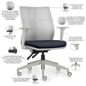 Color: CinzaAzul | ColorFamily: Cinza | ColorSimple: Cinza | ColorSupplier: CinzaAzul | Com apoio de braços: Sim | Com aro para pés: Não | Com rodas: Sim | Cor: CinzaAzul | Formato de venda: Unitário | Materiais do aro para pés: na | Material: Polímero injetado, espuma injetada, tela dublada vulcanizada, rodízios em PU, revestimento em Sintét | Material do estofamento: Espuma Injetada | MaterialFamily: Polímero | Model: Flow Diretor | Modelo: Flow Diretor | Modelo detalhado: Flow Diretor | OriginCountry: Brasil | OriginState: PR | ProductContents: 01 Cadeira de Escritório | ProductHeight: 81 cm | ProductInstructions: Produto para uso em ambiente interno, nao devendo ficar exposto ao sol, calor e umidade excessivos. | ProductLength: 71 cm | ProductWarranty: 90 dias após o recebimento do produto | ProductWeight: 13 kg | ProductWidth: 71 cm | Requer montagem: Sim | SizeDescription: Altura: 81 cm x Largura: 71 cm x Profundidade: 71 cm | SupplierSimpleName: Cadeira de Escritório Giratória Diretor Flow F02 Base Cinza Sintético Azul - Lyam Decor | Tipo de cadeira de escritório: Diretor Giratória
