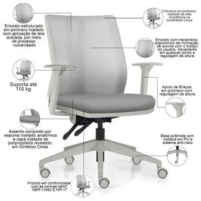 Color: CinzaCinza | ColorFamily: Cinza | ColorSimple: Cinza | ColorSupplier: CinzaCinza | Com apoio de braços: Sim | Com aro para pés: Não | Com rodas: Sim | Cor: CinzaCinza | Formato de venda: Unitário | Materiais do aro para pés: na | Material: Polímero injetado, espuma injetada, tela dublada vulcanizada, rodízios em PU, revestimento em Sintét | Material do estofamento: Espuma Injetada | MaterialFamily: Polímero | Model: Flow Diretor | Modelo: Flow Diretor | Modelo detalhado: Flow Diretor | OriginCountry: Brasil | OriginState: PR | ProductContents: 01 Cadeira de Escritório | ProductHeight: 81 cm | ProductInstructions: Produto para uso em ambiente interno, nao devendo ficar exposto ao sol, calor e umidade excessivos. | ProductLength: 71 cm | ProductWarranty: 90 dias após o recebimento do produto | ProductWeight: 13 kg | ProductWidth: 71 cm | Requer montagem: Sim | SizeDescription: Altura: 81 cm x Largura: 71 cm x Profundidade: 71 cm | SupplierSimpleName: Cadeira de Escritório Giratória Diretor Flow F02 Base Cinza Sintético Cinza - Lyam Decor | Tipo de cadeira de escritório: Diretor Giratória