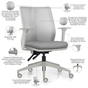 Peso máximo suportado 110 kg, com uso recomendado de 8 horas diária.