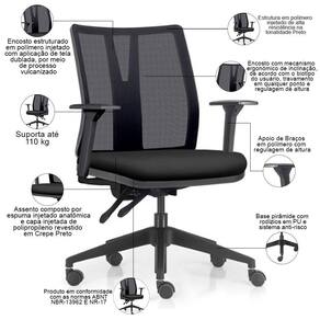 Color: PretoPreto | ColorFamily: Preto | ColorSimple: Preto | ColorSupplier: PretoPreto | Com apoio de braços: Sim | Com aro para pés: Não | Com rodas: Sim | Cor: PretoPreto | Formato de venda: Unitário | Materiais do aro para pés: na | Material: Polímero injetado, espuma injetada, tela dublada vulcanizada, rodízios em PU, revestimento em Crepe | Material do estofamento: Espuma Injetada | MaterialFamily: Polímero | Model: Flow Diretor | Modelo: Flow Diretor | Modelo detalhado: Flow Diretor | OriginCountry: Brasil | OriginState: PR | ProductContents: 01 Cadeira de Escritório | ProductHeight: 81 cm | ProductInstructions: Produto para uso em ambiente interno, nao devendo ficar exposto ao sol, calor e umidade excessivos. | ProductLength: 71 cm | ProductWarranty: 90 dias após o recebimento do produto | ProductWeight: 13 kg | ProductWidth: 71 cm | Requer montagem: Sim | SizeDescription: Altura: 81 cm x Largura: 71 cm x Profundidade: 71 cm | SupplierSimpleName: Cadeira de Escritório Giratória Diretor Flow F02 Base Preta Crepe Preto - Lyam Decor | Tipo de cadeira de escritório: Diretor Giratória