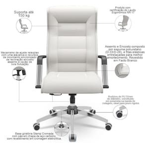 Color: Branco | ColorFamily: Branco | ColorSimple: Branco | ColorSupplier: Branco | Com apoio de braços: Sim | Com aro para pés: Não | Com rodas: Sim | Cor: Branco | Formato de venda: Unitário | Materiais do aro para pés: na | Material: Madeira, Poliuretano, Facto | Material do estofamento: Espuma de Poliuretano Injetada | MaterialFamily: Poliuretano | Model: Kirk | Modelo: Kirk | Modelo detalhado: Kirk | OriginCountry: Brasil | OriginState: PR | ProductContents: 01 Cadeira | ProductHeight: 119 cm | ProductInstructions: Produto para uso em ambiente interno, nao devendo ficar exposto ao sol, calor e umidade excessivos. | ProductLength: 81 cm | ProductWarranty: 90 dias após o recebimento do produto | ProductWeight: 23 kg | ProductWidth: 66 cm | Requer montagem: Sim | SizeDescription: Altura: 119 cm x Largura: 66 cm x Profundidade: 81 cm | SupplierSimpleName: Cadeira De Escritório Giratória Presidente Base Cromada Kirk P03 Facto Branco - Lyam Decor | Tipo de cadeira de escritório: Presidente Giratória
