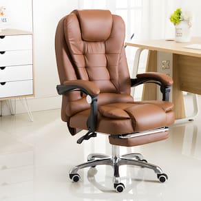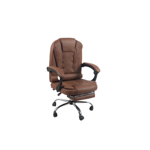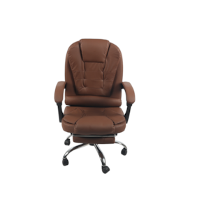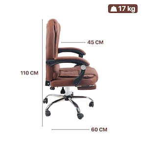 Especificações Cor: Marrom Revestimento: Couro sintético resistente e elegante Apoio para os pés retrátil: permite relaxar as pernas com praticidade Encosto reclinável: ajustável entre 90° e 150°, ideal para aliviar a tensão nas costas Estrutura: armação metálica robusta com espuma de alta densidade para suporte prolongado Capacidade de carga: até 150 kg, com base giratória e rodízios silenciosos de 360° Dimensões do Produto Embalado: 69 x 26 x 58 cm (AxLxC) Dimensões do Produto: 95 x 45 x 43 cm (AxLxC)