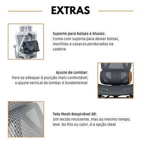 A limpeza pode ser realizada com um pano úmido e detergente neutro, garantindo a preservação do acabamento em Tela Mesh Nylon e a durabilidade da cadeira.
