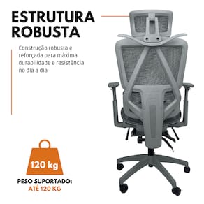 A limpeza pode ser realizada com um pano úmido e detergente neutro, garantindo a preservação do acabamento em Tela Mesh Nylon e a durabilidade da cadeira.