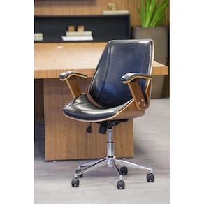 Cadeira office giratória com ajuste de altura, estrutura em madeira com estofado revestido em poliuretano (PU), possui apoio para braços. Base cromada em formato estrela com rodízios em nylon. Acabamento da Estrutura: Verniz Almofada do assento: Fixa Altura do assento até o chão: 55 Ambiente Principal: Escritório Apoio para Braços Estofado: Sim Complexidade da Montagem: Baixa: pode ser montado por uma pessoa sozinha Cor: Preto Cor do Produto: Preto Dobrável: Não Enchimento do Assento: Espuma D-28 Enchimento do Encosto: Espuma D-28 Escala de Brilho: Semi-Brilho Estrutura do Assento: Madeira compensada - nogueira Estrutura do Encosto: Madeira compensada - nogueira Giratória: Sim Informações Complementares: Cadeira office giratória com ajuste de altura (altura mínima 91cm e máxima 99cm), estrutura em madeira com estofado revestido em poliuretano (PU), possui apoio para braços. Base cromada em formato estrela com rodízios em nylon. Itens Inclusos: 1 Cadeira e Manual de Instruções. Linha ou Coleção: Office Manual de Especificação Técnica: Manual de Montagem e Instalação: https://cdn2.madeiramadeira.com.br/atributo/rivatti/856043-manual-office-lisboa-sem-encosto-aj18.pdf Material da Base: Aço Cromado Necessita Montagem: Sim Origem do Produto: Importado Peso: 15 Possui Apoio para Braços: Sim Possui Apoio Para os Pés: Não Possui Rodízio: Sim Recomendações de Uso, Manutenção e Limpeza: Uso interno. Não expor ao sol ou umidade. Não exceder a capacidade de peso. Limpar com pano macio umedecido em solução de água e sabão neutro e secar em seguida. Não utilizar produtos químicos ou abrasivos. Revestimento do Assento: Poliuretano Revestimento do Encosto: Poliuretano Rodízio com Trava: Não Sistema de Montagem: Encaixe e parafusos Suporta Até (kg): 120 Tipo de Assento: Regulável Tipo de Encosto: Regulável Tipo de Madeira Maciça: Nogueira