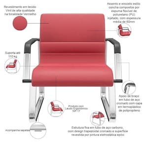 Color: Vermelho | Modelo detalhado: Lev com Braços Base Cromada | Com aro para pés: Não | Cor: Vermelho | Tipo de cadeira de escritório: Cadeira Recepção, Sala de Espera | Formato de venda: Unitário | Model: Lev | Material do estofamento: Vinil | ProductWeight: 15 kg | ProductContents: 01 Cadeira, manual de instruções | MaterialFamily: Vinil | OriginCountry: | Modelo: Lev | ColorSimple: Vermelho | ColorSupplier: Vermelho | Requer montagem: Sim | SizeDescription: Altura: 82 cm x Largura: 77 cm x Profundidade: 66 cm | ProductWidth: 77 cm | ColorFamily: Vermelho | Com apoio de braços: Sim | Com rodas: Não | OriginState: PR | SupplierSimpleName: Cadeira de Escritório Recepção com Braço Fixa Cromada Lev P03 Vinil Vermelho - Lyam Decor | ProductHeight: 82 cm | Materiais do aro para pés: na | de registrocertificação INMETRO: ABNT NBR 13962, ABNT ABNT NM 300, NR 17 | ProductWarranty: 90 dias após o do produto | ProductInstructions: Produto para uso em ambiente interno, nao devendo ficar exposto ao sol, calor e umidade excessivos. | Material: Tubo de Aço Carbono, Espuma ível Poliuretano, Vinil | ProductLength: 66 cm