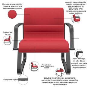 ColorFamily: Vermelho | Material: Tubo de Aço Carbono, Espuma ível Poliuretano, Crepe | Material do estofamento: Crepe | Materiais do aro para pés: na | Com rodas: Não | de registrocertificação INMETRO: ABNT NBR 13962, ABNT ABNT NM 300, NR 17 | OriginCountry: | OriginState: PR | ColorSupplier: Vermelho | Modelo: Lev | Color: Vermelho | Formato de venda: Unitário | SizeDescription: Altura: 82 cm x Largura: 77 cm x Profundidade: 66 cm | ProductInstructions: Produto para uso em ambiente interno, nao devendo ficar exposto ao sol, calor e umidade excessivos. | ProductHeight: 82 cm | SupplierSimpleName: Cadeira de Escritório Recepção com Braço Fixa Preta Lev P03 Crepe Vermelho - Lyam Decor | ProductLength: 66 cm | Modelo detalhado: Lev com Braços Base Preta | MaterialFamily: Crepe | ProductContents: 01 Cadeira, manual de instruções | ProductWidth: 77 cm | ProductWarranty: 90 dias após o do produto | ProductWeight: 15 kg | Model: Lev | Cor: Vermelho | Tipo de cadeira de escritório: Cadeira Recepção, Sala de Espera | Com aro para pés: Não | ColorSimple: Vermelho | Com apoio de braços: Sim | Requer montagem: Sim