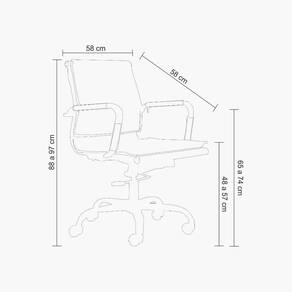 Design contemporâneo que agrega elegância e estilo para o seu dia a dia. Cadeira Office com encosto baixo, estrutura em aço cromado e revestida em PU, possui regulagem de altura do assento com pistão á gás e sistema relax, possui base giratória em aço cromado com rodízios em nylon.
