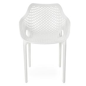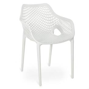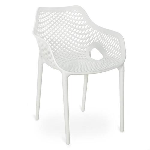A concha anatômica abraça o corpo e favorece a postura à mesa, enquanto os braços oferecem apoio extra para conversas mais longas e refeições descontraídas. A superfície vazada melhora a ventilação do encosto e do assento, contribuindo para uma sensação de frescor no uso diário.