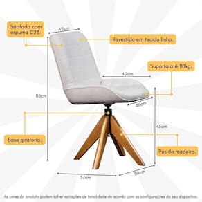 Cadeira De Jantar Estofada E Giratória Multimóveis Cr50095 Off White Off White A Cadeira de Jantar Estofada e Giratória Multimóveis CR50095 é a escolha ideal para quem busca aliar conforto e sofisticação na decoração da sala de jantar. Estofada com espuma D23, ela oferece um assento confortável e duradouro. O revestimento em tecido linho confere um toque suave e elegante, proporcionando um visual sofisticado. Seus pés em madeira garantem robustez e um acabamento refinado, enquanto a base giratória adiciona praticidade e versatilidade no uso diário. Com capacidade para suportar até 110 kg, esta cadeira combina segurança e resistência. O design moderno da cadeira é perfeito para compor ambientes contemporâneos e acolhedores, elevando a experiência das suas refeições com estilo e conforto. Conteúdo da Embalagem: 1 (uma) Cadeira de Jantar