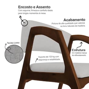 O assento com espuma de alta densidade D26 garante conforto prolongado, enquanto o encosto estofado com espuma D20 proporciona apoio suave e ergonômico. Revestida em tecidos nobres, a cadeira alia maciez e durabilidade, adaptando-se com facilidade a diferentes estilos de decoração.