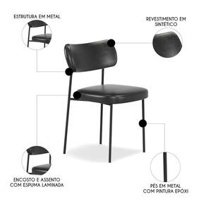 Peso Suportado: 120Kg, sem impacto.Revestimento: Sintético.Possui Pés: Sim.Material dos Pés: Metal.Acabamento: Pintura epóxi.Possui Rodízios: Não.Diferenciais:- Design Moderno.- Estilo Industrial.- Acabamento de ótima qualidade.- Pés metálicos.Sistema de Montagem: Parafusos/Ponteiras. Necessita Montagem: Somente parafusar a base metálica e encaixar a ponteira.Manual de Montagem: Sim.Complexidade da Montagem: Baixo.Volumes: 1 Volume.Conteúdo da Embalagem: 4 Cadeiras. do fabricante: 90 dias contra defeito de fabricação.Montagem: Recomendamos que seja feita por um .Recomendação de Limpeza: Utilize pano levemente úmido.Observações importantes- Produto para uso residencial em ambiente interno, não devendo ficar exposto diretamente ao sol, calor e umidades excessivas.- Pode haver alguma diferença de tonalidade entre a imagem e o produto real, por conta do tratamento de imagens e a calibração de cores do seu monitor.- As imagens são meramente ilustrativas, não acompanham objetos de decoração e eletrônicos.- Ao receber a mercadoria, o cliente deve verificar as condições da embalagem, caso haja alguma não assine o comprovante de recebimento.- Montagem, desmontagem e outras instalações serão de responsabilidade do cliente. Não nos responsabilizamos, no ato da , por subir escadas/elevadores ou pelo transporte por guincho em apartamentos. Eventuais despesas são de responsabilidade do comprador.- Confira as dimensões do produto e certifique-se de que passará normalmente por supostos elevadores, portas, escadas e/ou corredores de sua residência.