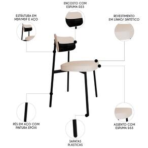 O revestimento em linho com detalhes em sintético de alta qualidade confere um toque de suavidade e sofisticação, enquanto o MDF/MDP no assento e encosto garante resistência e durabilidade ao produto. Projetada para oferecer o suporte necessário, possui assento em espuma D33 e encosto em espuma D23, proporcionando uma experiência ergonômica e confortável. Além de sua funcionalidade, o kit de Cadeiras Estofadas se destaca pelo design moderno e elegante, capaz de se adaptar a diversos ambientes da sua casa. Os pés fixos em aço com pintura epóxi na cor preta trazem estabilidade. Seja no Escritório, na Sala de Jantar ou até mesmo em um canto de leitura, ela se encaixa perfeitamente em qualquer ambiente. Seu encosto curvo não apenas proporciona conforto, mas também transforma o ambiente onde está inserida, conferindo um toque mais moderno aos seus espaços.