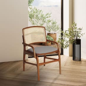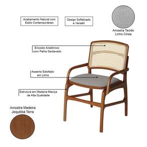 AS IMAGENS SÃO MERAMENTE ILUSTRATIVAS E PODEM SOFRER VARIAÇÕES DE COR E PEQUENOS DETALHES DE ACORDO COM O SEU MONITOR, ILUMINAÇÃO DO AMBIENTE E ATÉ MESMO A SUA PERCEPÇÃO VISUAL.Cadeira de Jantar FlorenÃa Madeira Jequitibà Terra com BraÃo Linho - Cinza e Encosto de Palha